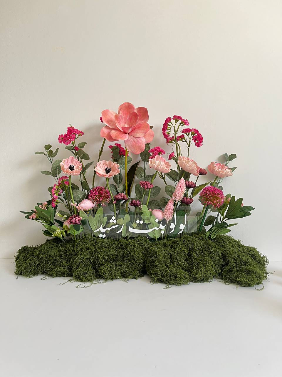 تنسيق ورد صناعي فاخر على قاعدة عشبية طولية، مع خيار اضافة تغريسة أكريلك قابلة للتخصيص (مقوسة أو مستطيلة) باسم المولود أو عبارة ترحيبية. يأتي بأطوال متعددة (40، 50، 60، 70 سم) ليناسب كل مساحة وكل ذوق، ويُعتبر خيار مثالي لهدية استقبال، جلسات تصوير البيبي، أو تزيين ركن الضيافة بأسلوب راقٍ ومميز.